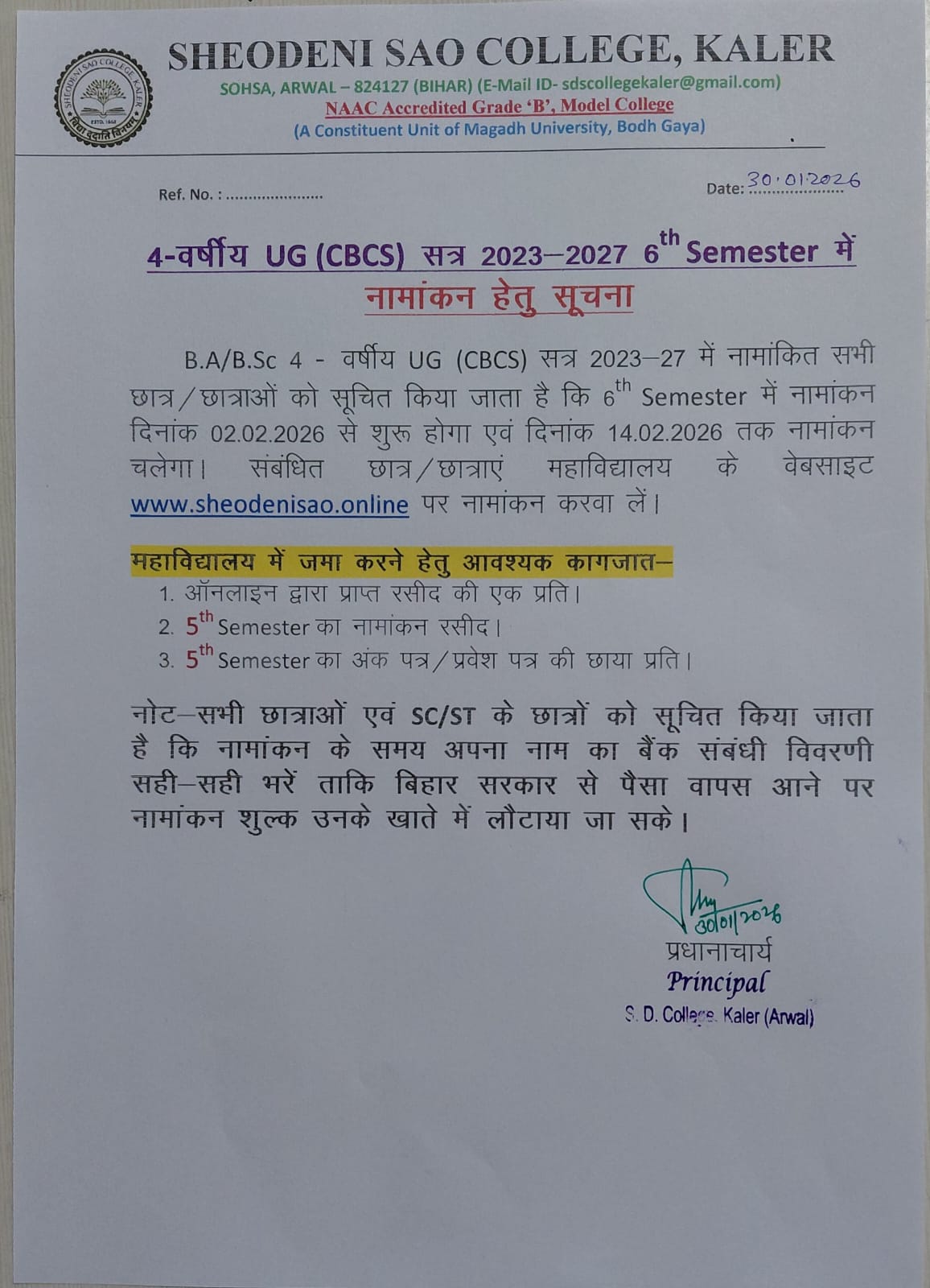 6th Sem. Admission Notice