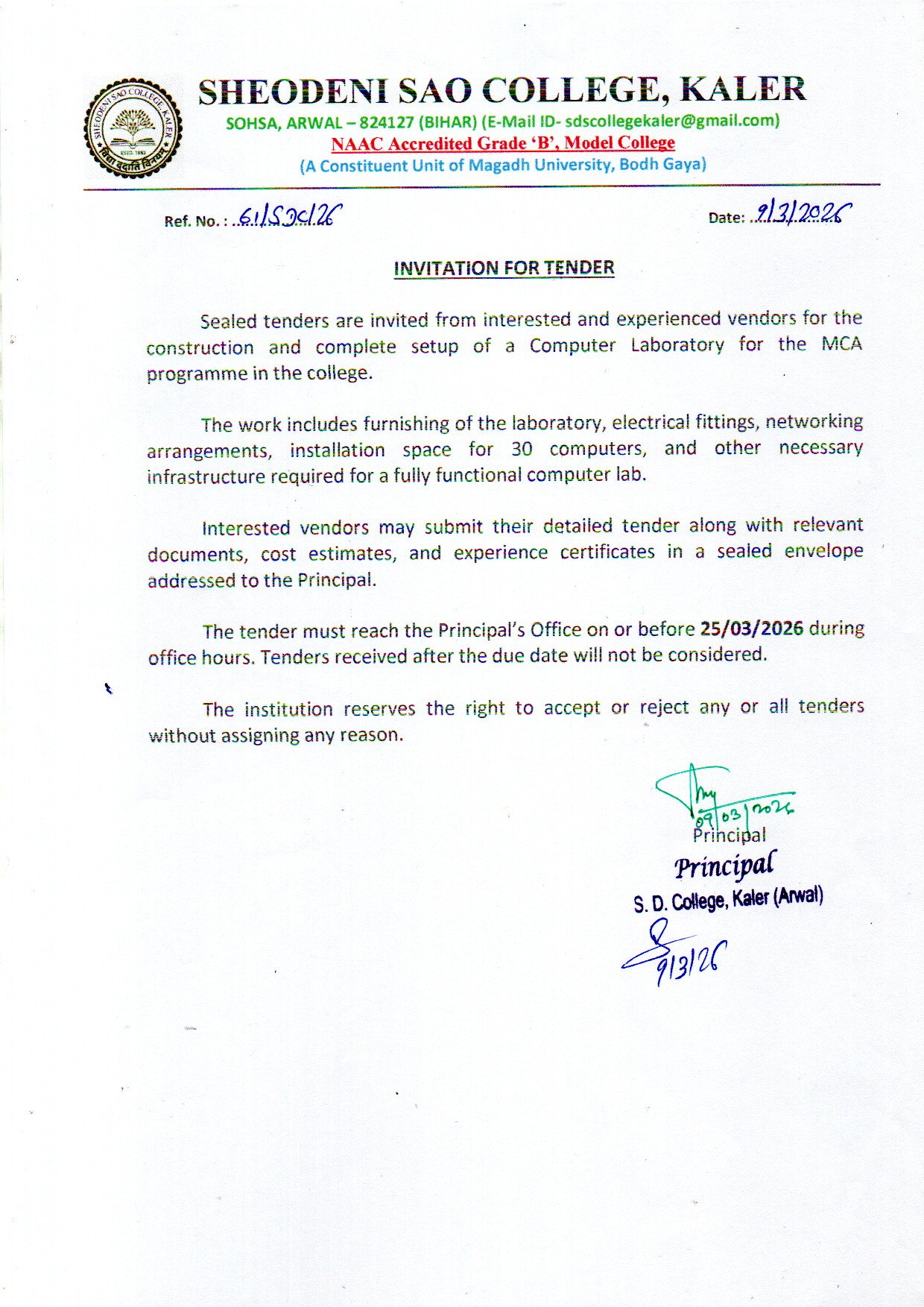 >> TENDER FOR MCA LAB