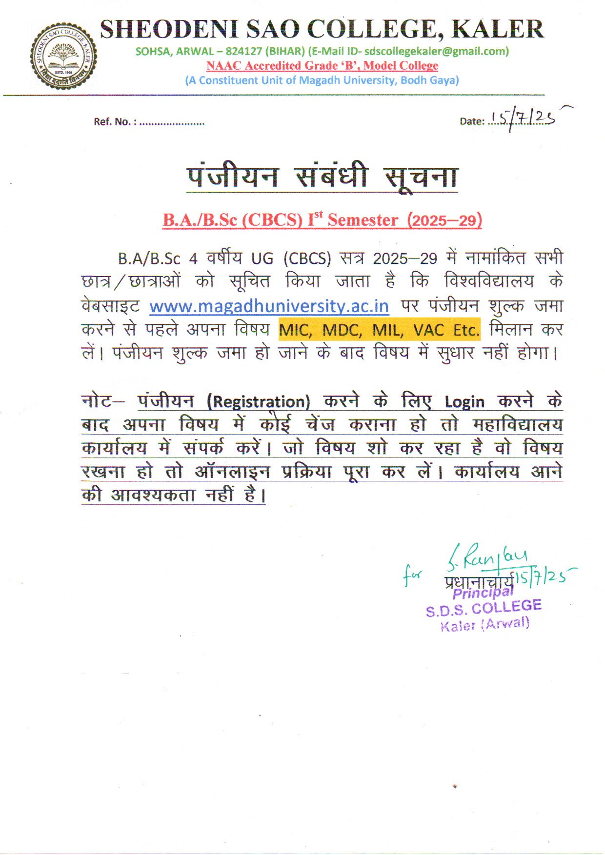 News & Updates >> BA BSC REGISTRATION NOTICE 2025-29