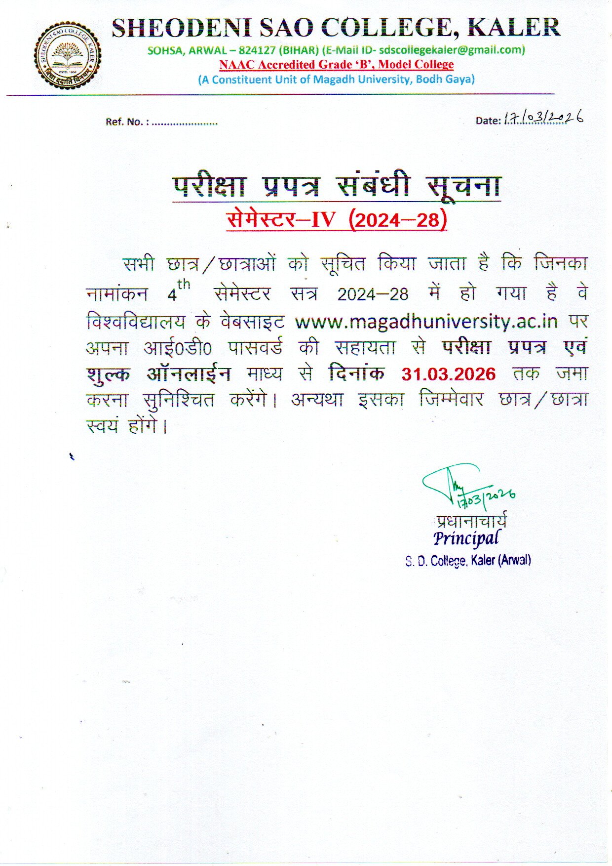 News & Updates >> EXAM FORM NOTICE 4TH SEM. 2024-28