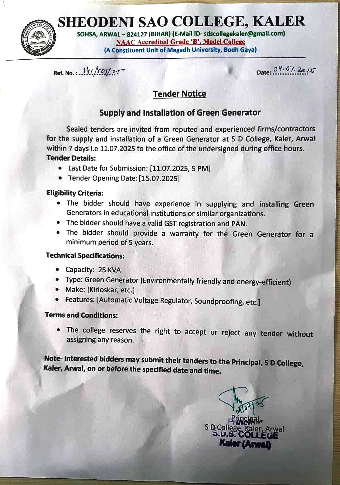 TENDER NOTICE FOR GENERATOR 04.07.2025